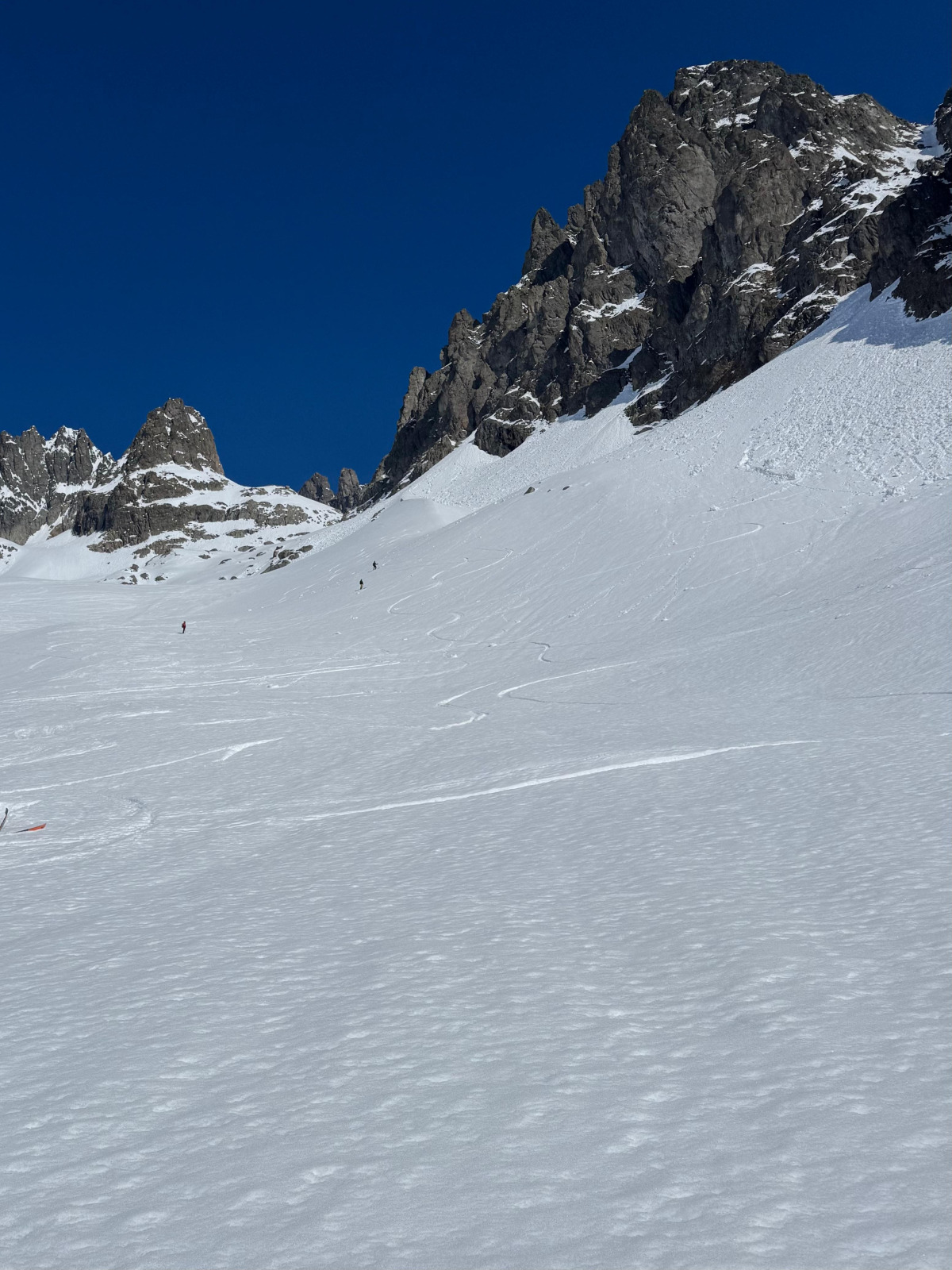 Der starke Wind erlaubte keine längere Gipfelrast, weshalb wir unsere Mittagsverpflegung später unten beim Steingletscher nachholten. Die Abfahrt bot typische Frühlingsverhältnisse: oben noch guter Schnee, weiter unten zunehmend tiefer Sulz.