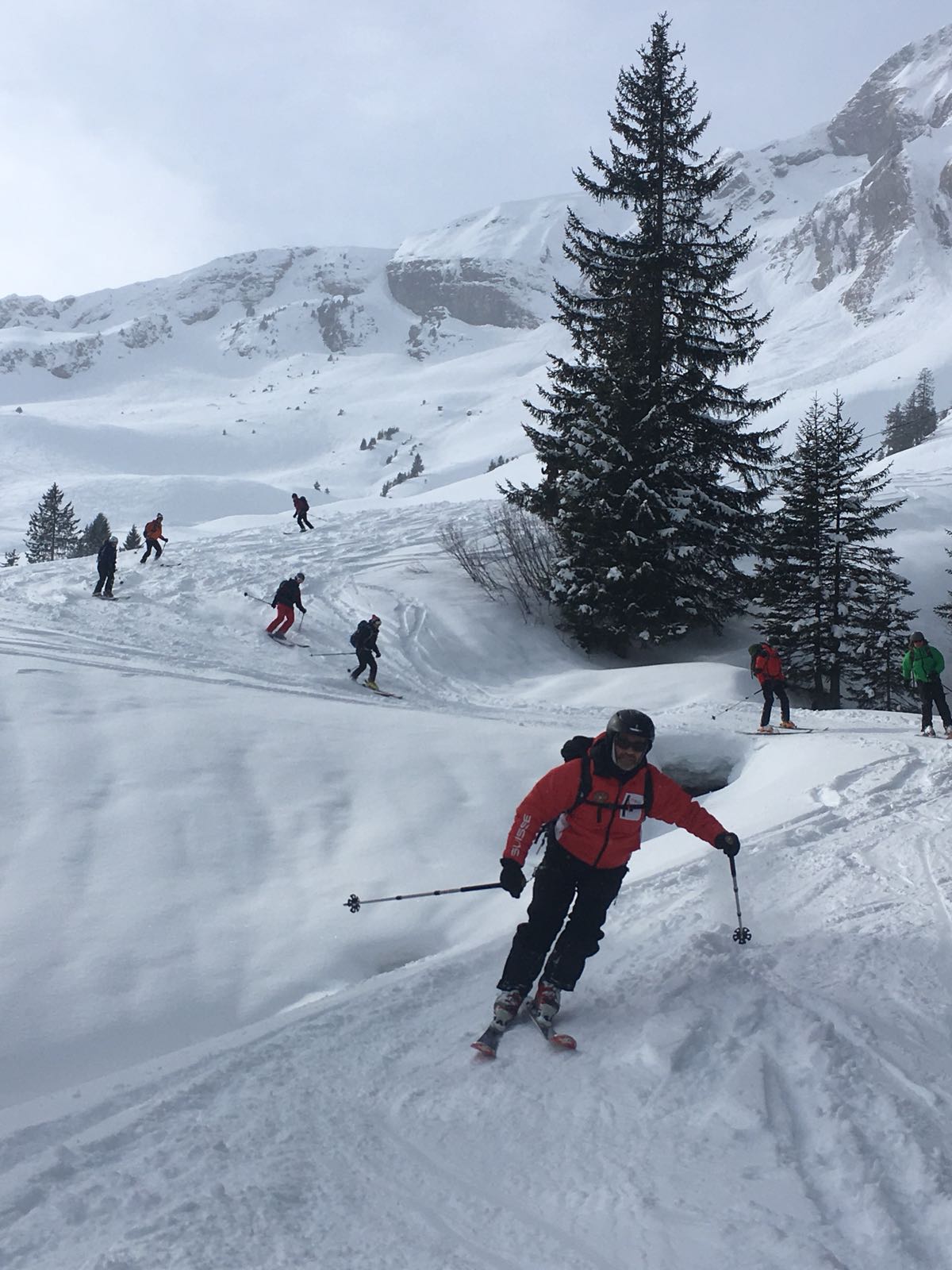 Verhältnisse: Ca. 20 cm Pulver von oben bis unten, auf einer tragenden harten Schicht. Auf unserer Höhenlage sehr günstige Lawinensituation dank vorhergegangenem "verfestigenden" Wetter (Regen bis hoch hinauf, Sonne).