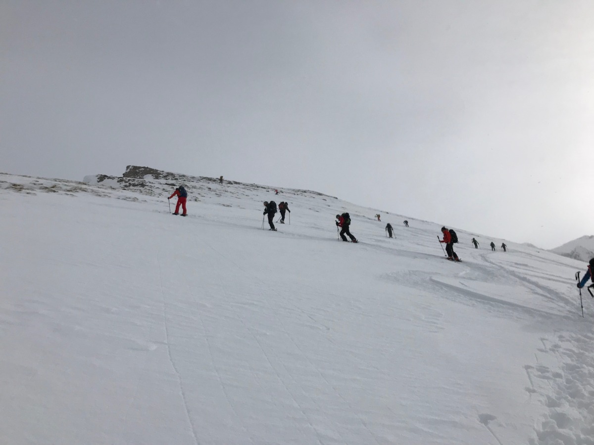 Daheim geblieben sind allerdings wenige, wir waren eine Gruppe von 18 Personen. Einerseits eine Freude, so vielen eine Tour ermöglichen zu können, und andererseits auch eine Herausforderung; eine solche Teilnehmerzahl wird langsam aber sicher unübersichtlich und alleine fast unverwaltbar. Grosse Niveauunterschiede sind nicht vermeidbar, und auf Touren ab 1'000 m Höhenunterschied müssten wohl zwingend 2 ganz unabhängige Gruppen gebildet werden (2 Leiter). Ich konnte meinen Vater als Führer der langsameren Gruppe engagieren, sodass das Ganze einigermassen gut funktionierte. 3 TN warteten unterhalb des Gipfels bei einer Hütte, bei glücklicherweise angenehmen Bedingungen.