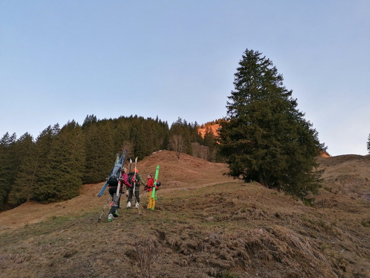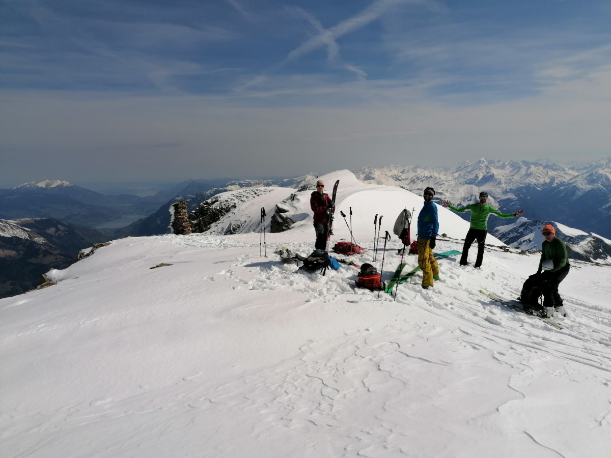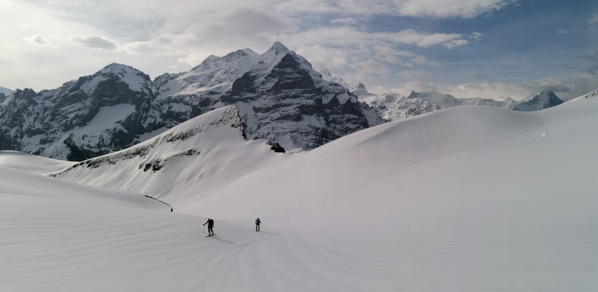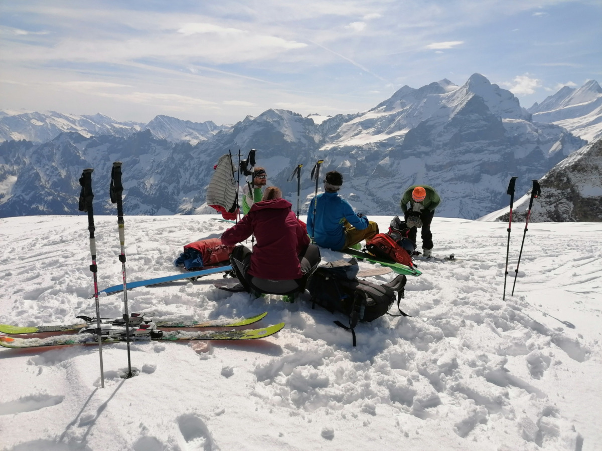 Als Ersatztour stiegen wir am Samstag auf den Wildgärst, von dem wir immerhin eine tolle Aussicht aufs Wetterhorn, die winterliche Gipfellandschaft und die Seen hatten. Dabei mussten die Skier bis auf ca. 1'700 m getragen werden (gut 35 min), ab dieser Höhe gab es genügend Schnee. Wir konnten mit den Skiern bis auf den Gipfel steigen (weniger verblasen als bisweilen an diesem Gipfel der Fall). Die Abfahrt war im oberen Teil lohnend, im unteren dann in bremsigem Sulz. Insgesamt ein genussvoller Tag im Schnee, der Lust auf weitere Frühlingstouren machte.