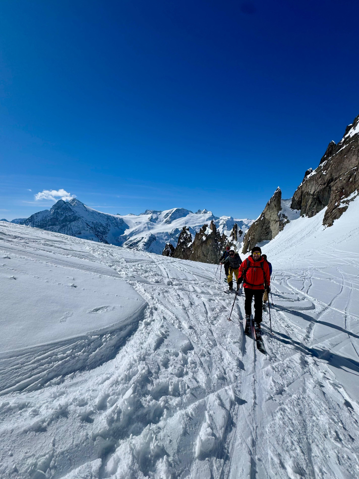 Der starke Wind erlaubte keine längere Gipfelrast, weshalb wir unsere Mittagsverpflegung später unten beim Steingletscher nachholten. Die Abfahrt bot typische Frühlingsverhältnisse: oben noch guter Schnee, weiter unten zunehmend tiefer Sulz.