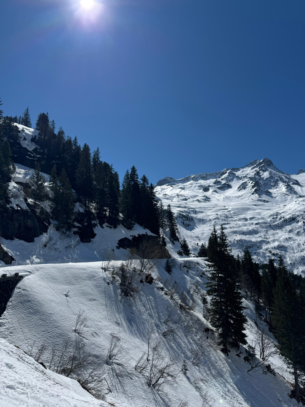 Die Strasse Richtung Steingletscher war noch stark eingeschneit und teilweise von Nassschneelawinen überzogen. Nach rund einer Stunde legten wir unsere erste kurze Pause ein. Die erste steile Passage bewältigten wir mit Harscheisen.
